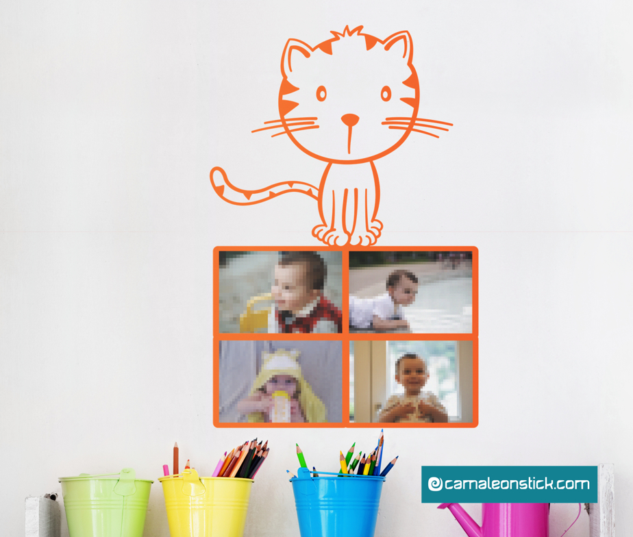 L'adesivo murale di un gattino che mostra le foto del vostro bambino. Il Portafoto gatto non può mancare nella cameretta ed è perfetto per arredare la parete sopra il lettino o il fasciatoio.
