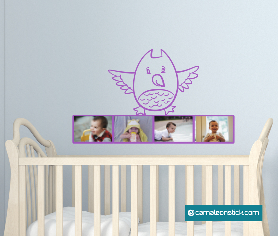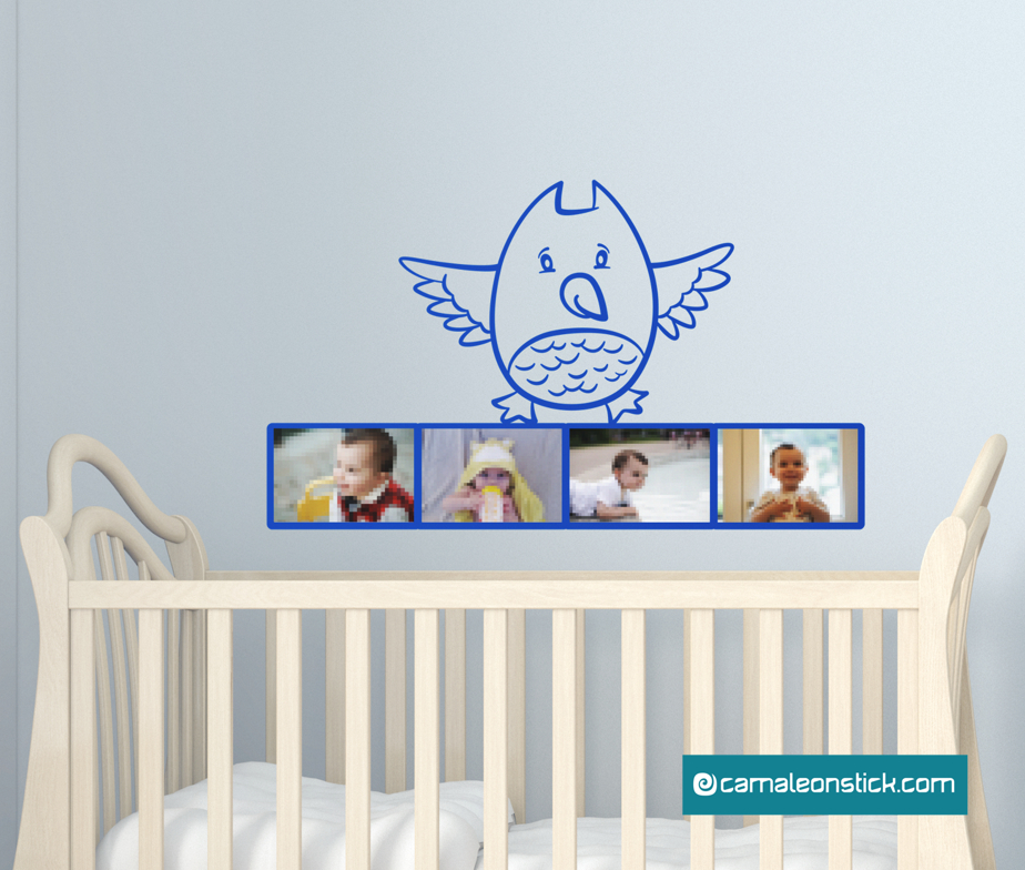 L'adesivo murale di un simpatico gufetto che mostra le foto del vostro bambino. Il Portafoto gufo non può mancare nella cameretta ed è perfetto per arredare la parete sopra il lettino o il fasciatoio.