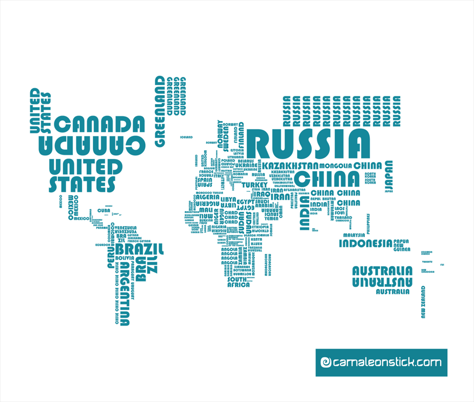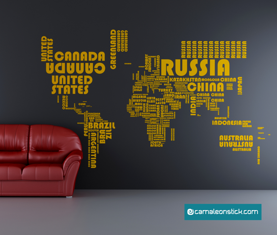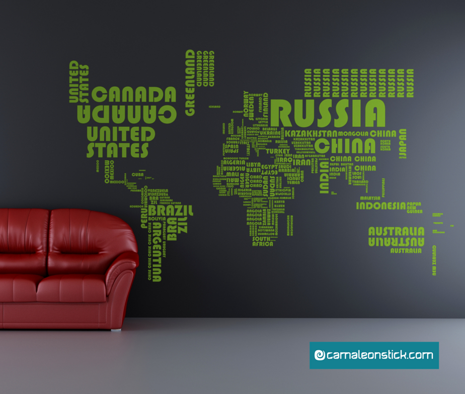 Adesivo da muro planisfero paesi della collezione wallstickers per decorare con stile ed eleganza. Il wallstickers è un mondo stilizzato e composto dalle scritte dei paesi di tutto il mondo che ne delimitano la forma.